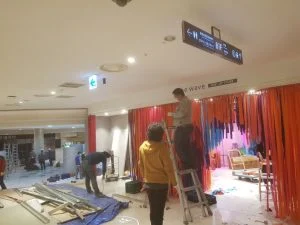 고객님들께 업체의 상품을 잘 보여주며 업체가 선정한 컨셉을 보여주는게 팝업스토어의 목적이기때문에 고객님과의 꼼꼼한 상담을 통해 인테리어 컨셉을 결정하고 있습니다. 팝업스토어의 입구를 고객님이 준비해주신 천을 천장에 고정하기 위해 현장 경험이 많은 전문가가 고객님과 꼼꼼히 체크하며 천장에 설치하고 있습니다.